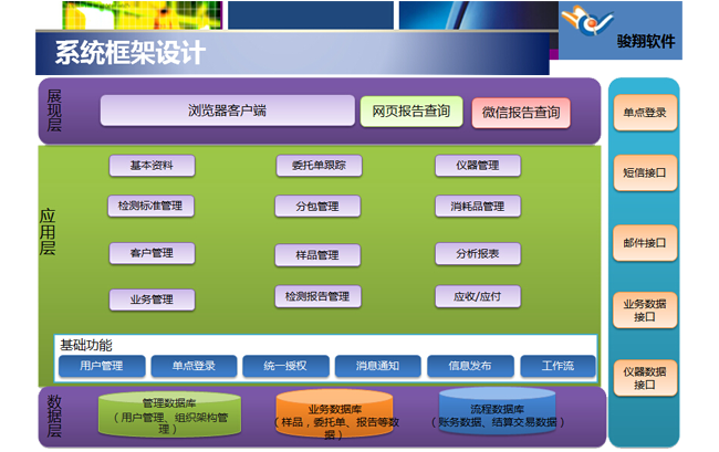 全面量化管理检测项目、指标、标准值等技术参数。支持短信电子邮件。支持移动端微信功能。