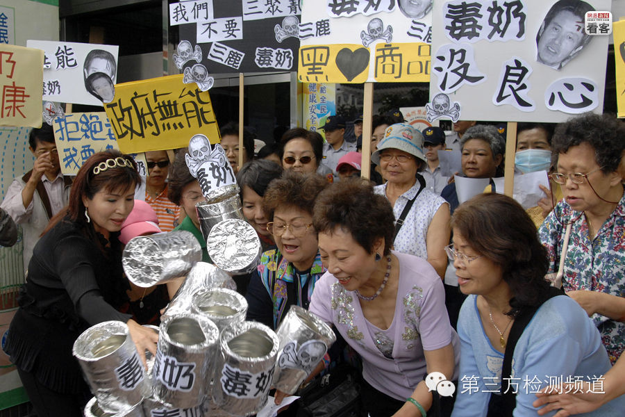 2008年10月14日,台北的抗议者推倒写有“毒奶”的罐子,抗议当局反应不足,扩大了污染事态。此前,国家质检总局通报称有25吨的问题奶粉流入台湾。