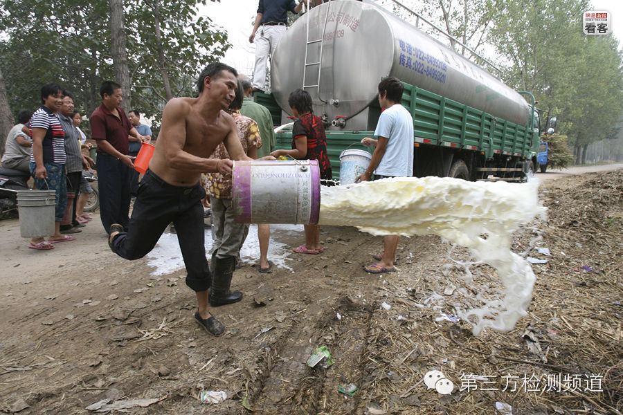 2008年9月24日,河南驻马店奶站,奶农忍痛将卖不出去的牛奶倒到沟里。三鹿奶粉事件爆发牵扯到众多乳品企业,大企业或停产或停止收购鲜奶,奶农受到重大打击。