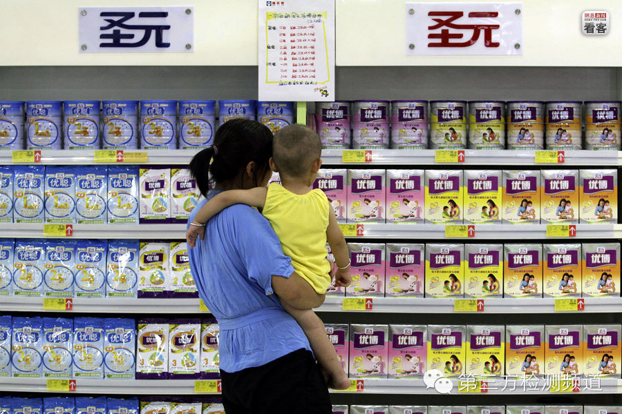 8月11日,在山东潍坊一家超市,一名母亲抱着孩子站在贴有优惠活动广告的圣元奶粉专柜前。据新华社8月10日援引中国卫生部发言人邓海华的话报导﹐针对媒体报导的有女婴疑因食用某品牌奶粉导致乳房过早发育问题﹐卫生部已责成湖北省食品安全监督领导小组办公室展开调查。