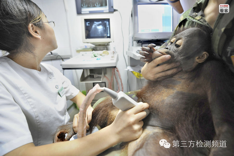 2008年9月24日,杭州,动物医生为一只1岁多的幼年红毛猩猩进行B超检查,发现有肾结石症状。杭州野生动物世界近两年来一直选用“三鹿”牌奶粉辅助喂养部分动物幼崽,喂食奶粉的幼年狮、虎、猩猩、绒猴等普遍出现排尿淋漓,尿液发黄、浑浊,营养不良等症状。