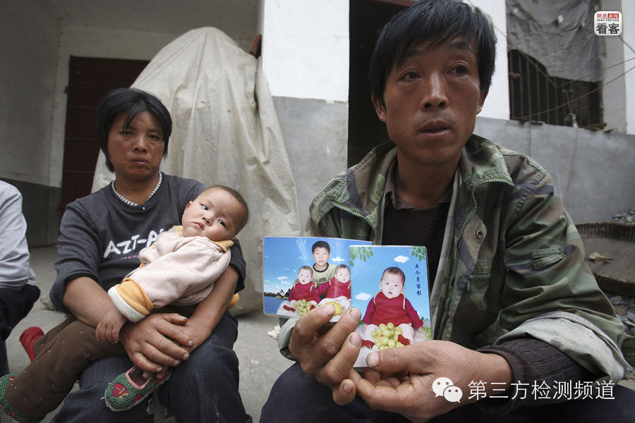 2008年10月19日,河南汝南,“毒奶粉”受害者家属拿着去世女儿的照片,他们的双胞胎女儿都因服用问题奶粉患病,最终一名女婴因肾病死亡。