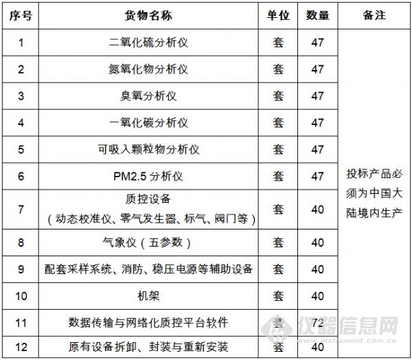 据编辑获悉,该项目名称为重庆市城市发展新区渝东北渝东南空气自动站建设采购项目,采购方为重庆市环境监测中心,采购用途则是根据环保部三步走要求,对重庆城市发展新区、渝东北生态涵养发展区和渝东南生态保护发展区40个空气自动监测站进行升级改造。 项目具体采购内容见下图,其中包括二氧化硫分析仪、氮氧化物分析仪、臭氧分析仪、一氧化碳分析仪、可吸入颗粒物分析仪、PM2.5分析仪等300余套监测仪器,值得注意的是,采购方在招标公告中明确标明:“投标产品必须为中国大陆境内生产”。