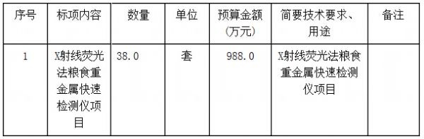 根据中国政府采购网4月16日消息,省粮食局(本级)就X射线荧光法粮食重金属快速检测仪项目进行公开招标(招标项目编号:ZZCG2015S-GK-016),将采购38套X射线荧光法粮食重金属快速检测仪,预算988万元。
