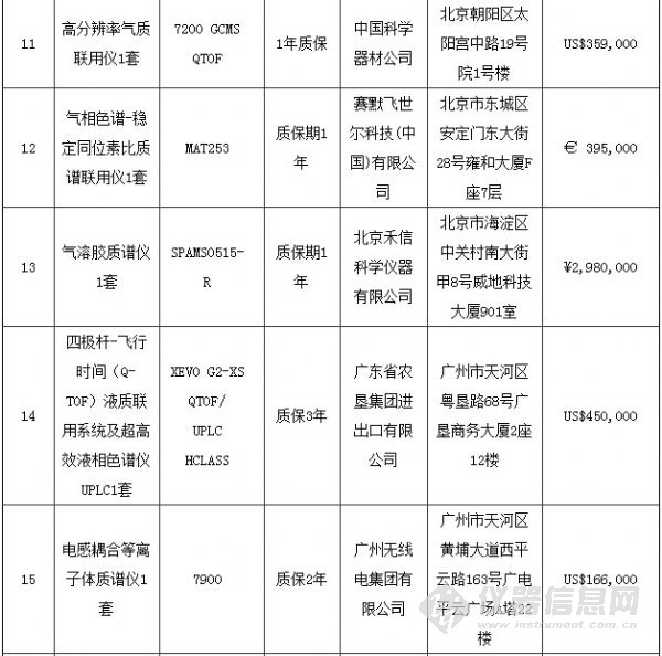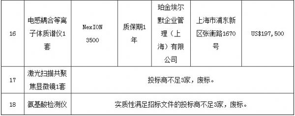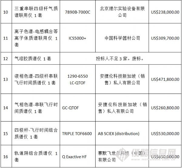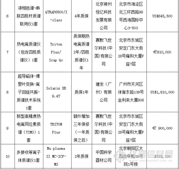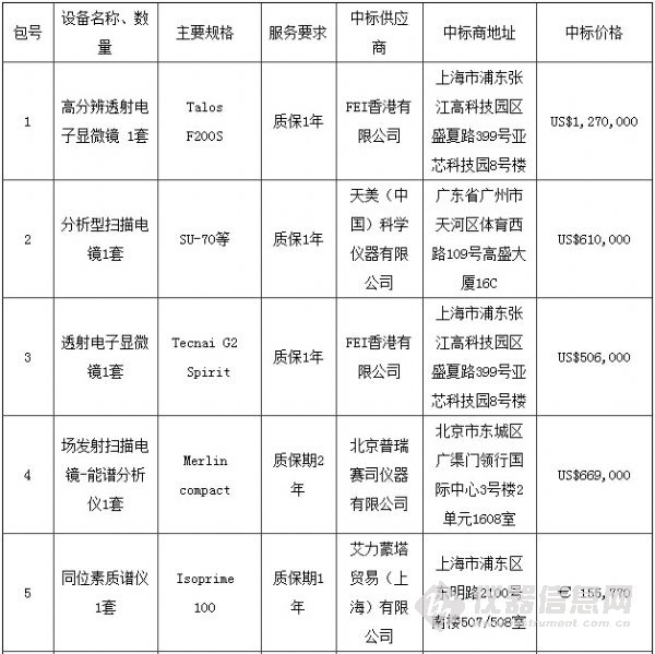 6月24日,中科院2015年仪器设备部门集中采购项目(OITC-G15023229)中标结果公布,中标金额为3838万元,采购了9套质谱、3套透射电镜、2套扫描电镜,中标品牌同样悉数大牌,如布鲁克、赛默飞、安捷伦、珀金埃尔默、SCIEX、日本电子、日立等。 在本次采购内容中包括一套气溶胶质谱仪,但因为投标厂商不足3家出现废标。而早在五天前(19日),中科院2015年仪器设备部门集中采购项目(OITC-G15032179)中的一套气溶胶质谱仪由广州禾信中标。该批次中标金额为6550万,采购了12套质谱、4套电镜,中标仪器品牌包括赛默飞、珀金埃尔默、沃特世、安捷伦、布鲁克、SCIEX、FEI、日立等。 下面让我们来围观一下这个让各个仪器大牌悉数登场的1.04亿仪器采购项目: 中科院2015年仪器设备部门集中采购项目(OITC-G15023229)