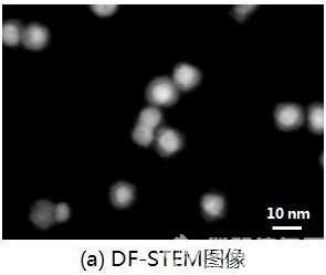 上图即为银铜纳米颗粒的BFSTEM画像和DFSTEM图像。 从BFSTEM画像可看出颗粒大小约为10 nm,高对比度观察下可确认颗粒的分布形式,即2个颗粒相邻或核-壳型分布。此外,从DFSTEM画像的Z对比度可看出银和铜是可以分离存在的。 图(a)是纳米颗粒的DFSTEM图像,图(b)是图(a)视野下的EDX mapping结果。从mapping图像可看出,DFSTEM图像不仅能确认颗粒的位置,还能区分出银和铜。DFSTEM图像中亮度高地颗粒是银,亮度低的颗粒是铜。