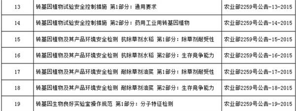 根据《中华人民共和国农业转基因生物安全管理条例》规定,《转基因植物及其产品成分检测 基体标准物质定值技术规范》等19项标准业经专家申请通过,现批准发布为中华人民共和国国家标准,自2015年8月1日起实施。