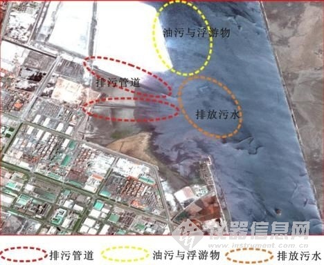 随着遥感技术的不断发展, 对地球诸多水环境要素进行动态监测成为现实。我国环境遥感应用领域的发展经历了从单纯的环境监测发展到了环境区划、环境影响评价和预测研究等。遥感水环境监测从一次性监测发展到了连续动态监测,从个别指标的定性研究扩展到了多目标、多层次的模型研究和定量分析,从单一卫星数据源的应用发展到了多数据源、多时相、多分辨率遥感数据的应用。遥感在水环境监测中发挥着越来越大的作用。 城市水污染监测 应用遥感手段,可以快速监测出水体污染源的类型、位置分布以及水体污染的分布范围等。下图是利用 SPOT5 卫星影像得到的某城市污水企业所排放的工业废水情况。