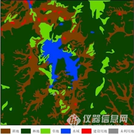 图 3 研究区土地利用信息 本方案主要监测水体富营养化情况, 考虑到水体温度和叶绿素对水体富营养化的影响,对计算温度植被指数(TNDVI)再分类提取。 温度植被指数(TNDVI)可利用空间建模获取,计算函数为: TNDVI=Sqrt[(Band4-Band3/Band4+Band3)+0.5] TNDVI 计算后,根据经验和野外验证(实测数据)对 TNDVI 指数分为四级指标,即: 0.41≤TNDVI<0.46 轻污染水体 0.46≤TNDVI<0.50 中等污染水体(轻) 0.50≤TNDVI<0.55 中等污染水体(重) 0.55≤TNDVI≤0.63 重污染水体