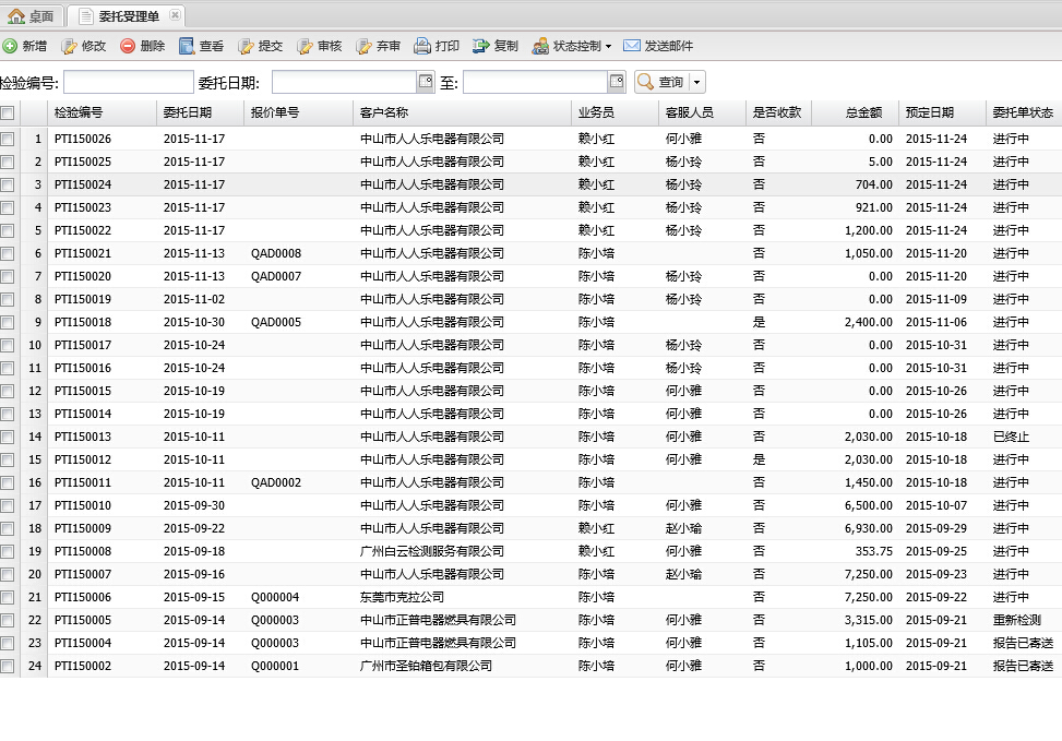 由客户报价、委托受理单、排单管理、订单跟踪、收款确认单等功能模块组成。 从客户报价、委托单处理、订单跟踪、不合格管理、收款确认一系列环节进行全方面跟踪.报价单审核生成委托单,审核通过后自动进入检测环节.最后根据订单编号生成收款单。随时查询历史报价,避免引起不必要的损失。支持短信收发或群发,邮件群发功能。