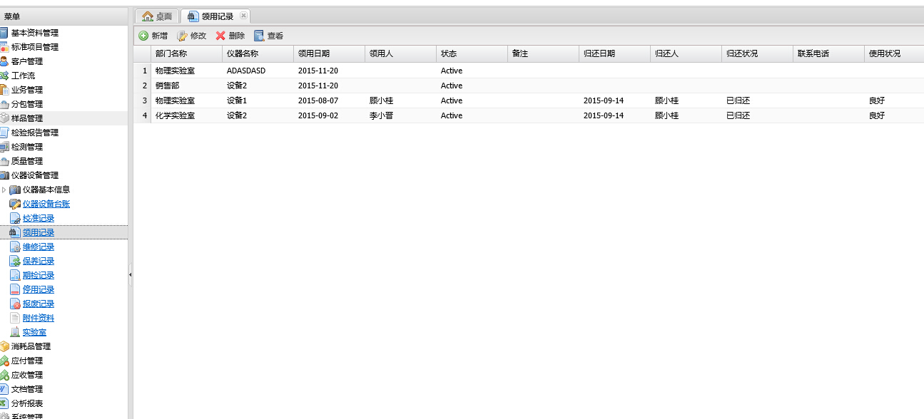 2. 仪器设备管理: 对仪器的基本信息、使用状态、使用档案等进行全程记录。
